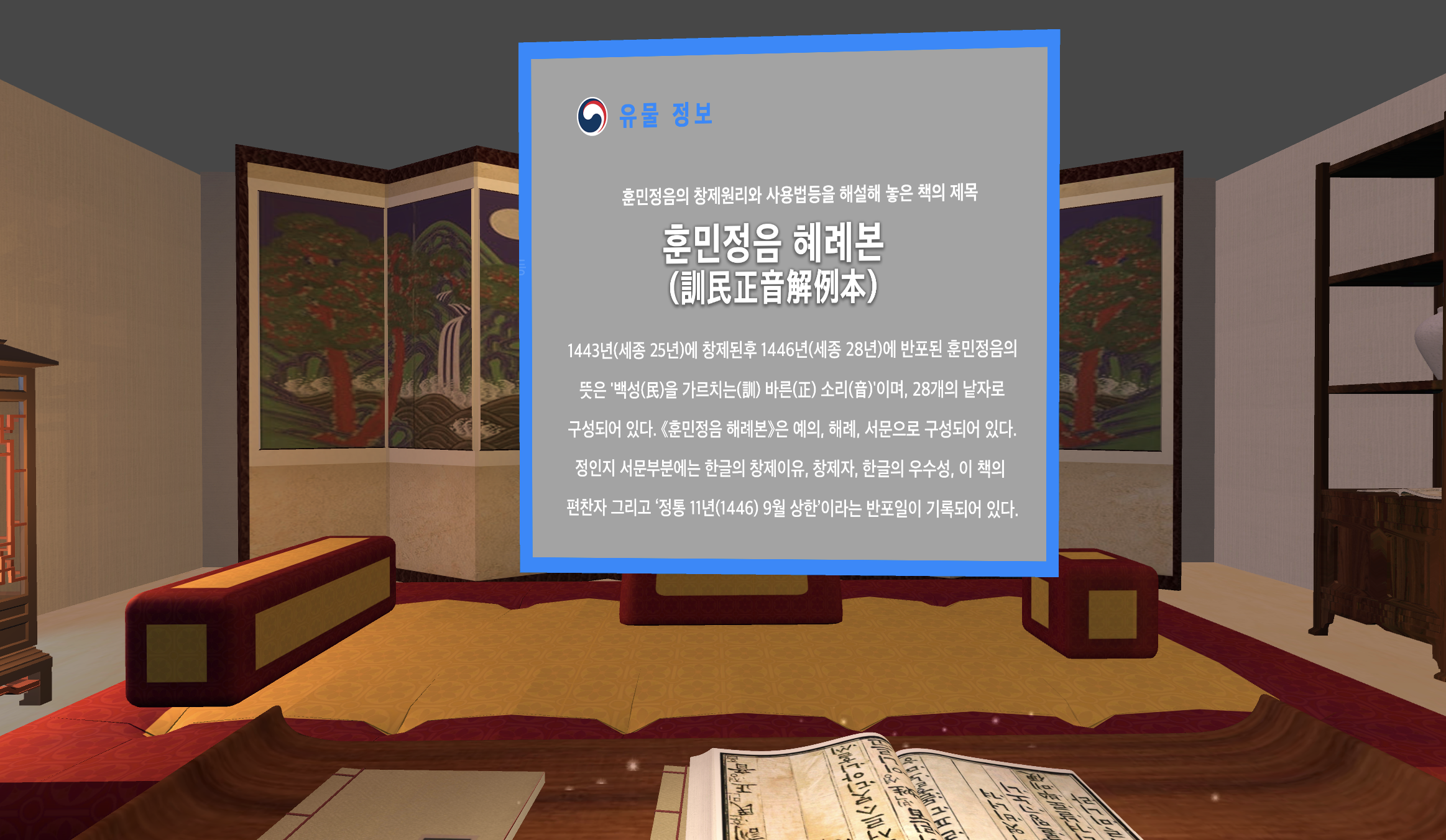 본 프로젝트는 과거로부터 물려받은 문화유산을 현재의 과학기술을 활용하여 우리만의 방식으로 새롭게 계승할 다양한 방법을 연구하는 데에서 시작하였습니다. 그중 현재까지도 우리의 생활에 가장 밀접하게 연관된 유산인 한글을 중심으로 세종대왕의 방을 VR로 제작하고자 하였습니다. VR로 제작된 세종대왕의 방은 세종대왕의 발명품에 다가가면 효과와 함께 발명품의 정보를 알 수 있는 설명창이 노출됩니다. VR을 통해 1433년, 과거로 돌아가 백성들을 위해 많은 발명품을 제작한 세종대왕의 애민 정신이 담긴 공간을 경험할 수 있도록 하고자 하였습니다. 이를 통해 문화유산을 단순한 지식 습득을 넘어서 더 깊이 이해하고 감성적으로 몰입하고자 합니다. 나아가 유니티의 VR 기술을 교육콘텐츠등 다양한 곳에 적용하여 VR 기술 활성화를 목표로 하였습니다.