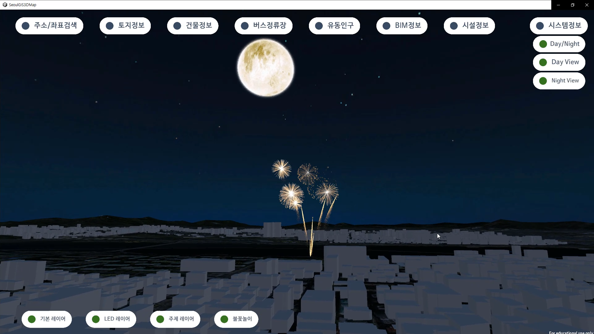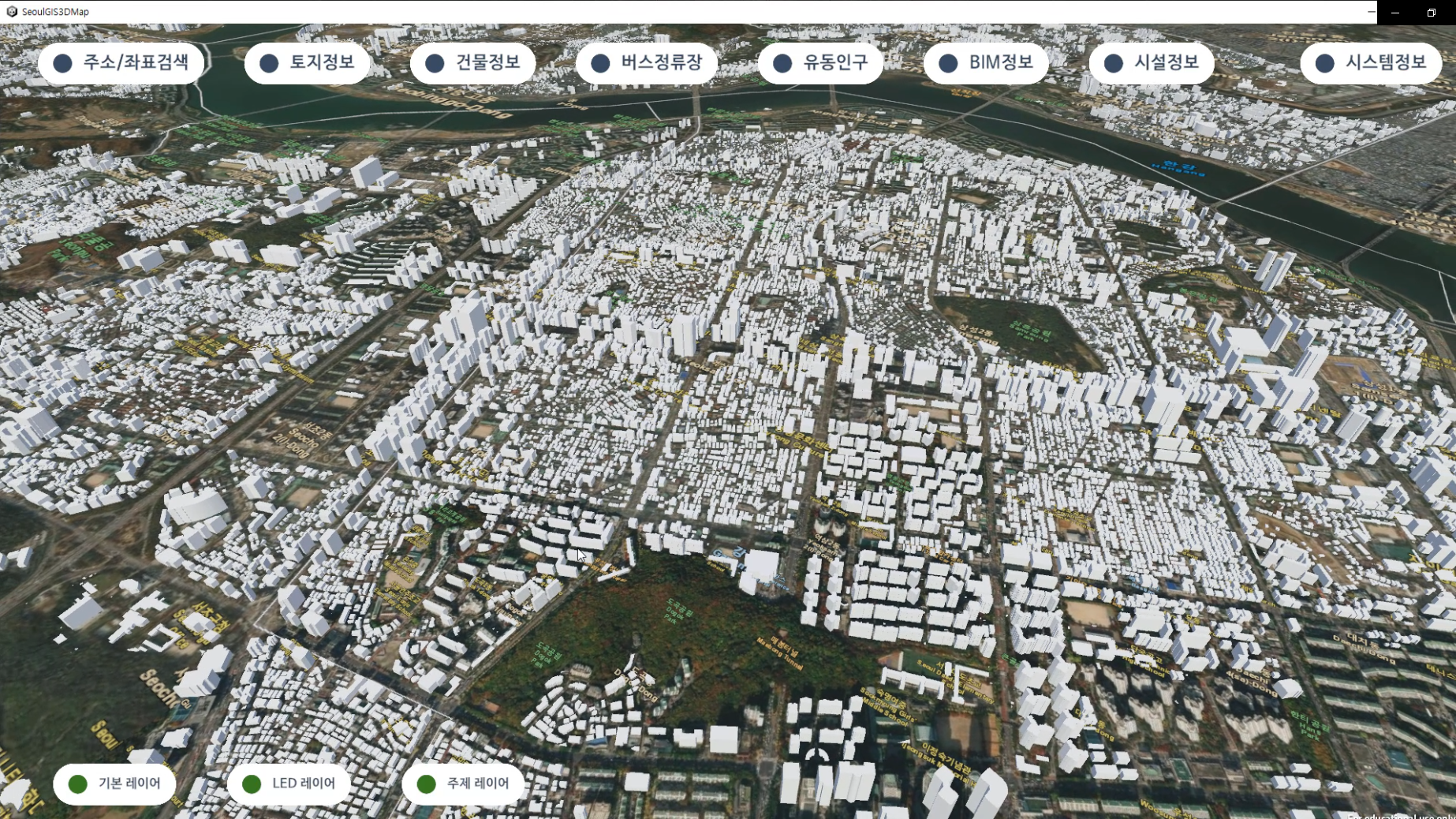 Unity 3D 게임엔진과 GIS 솔루션 기반으로 국가정보공공데이터를 활용하여 연계정보들을 3D 공간지도에 표출하도록 제작된 콘텐츠입니다.