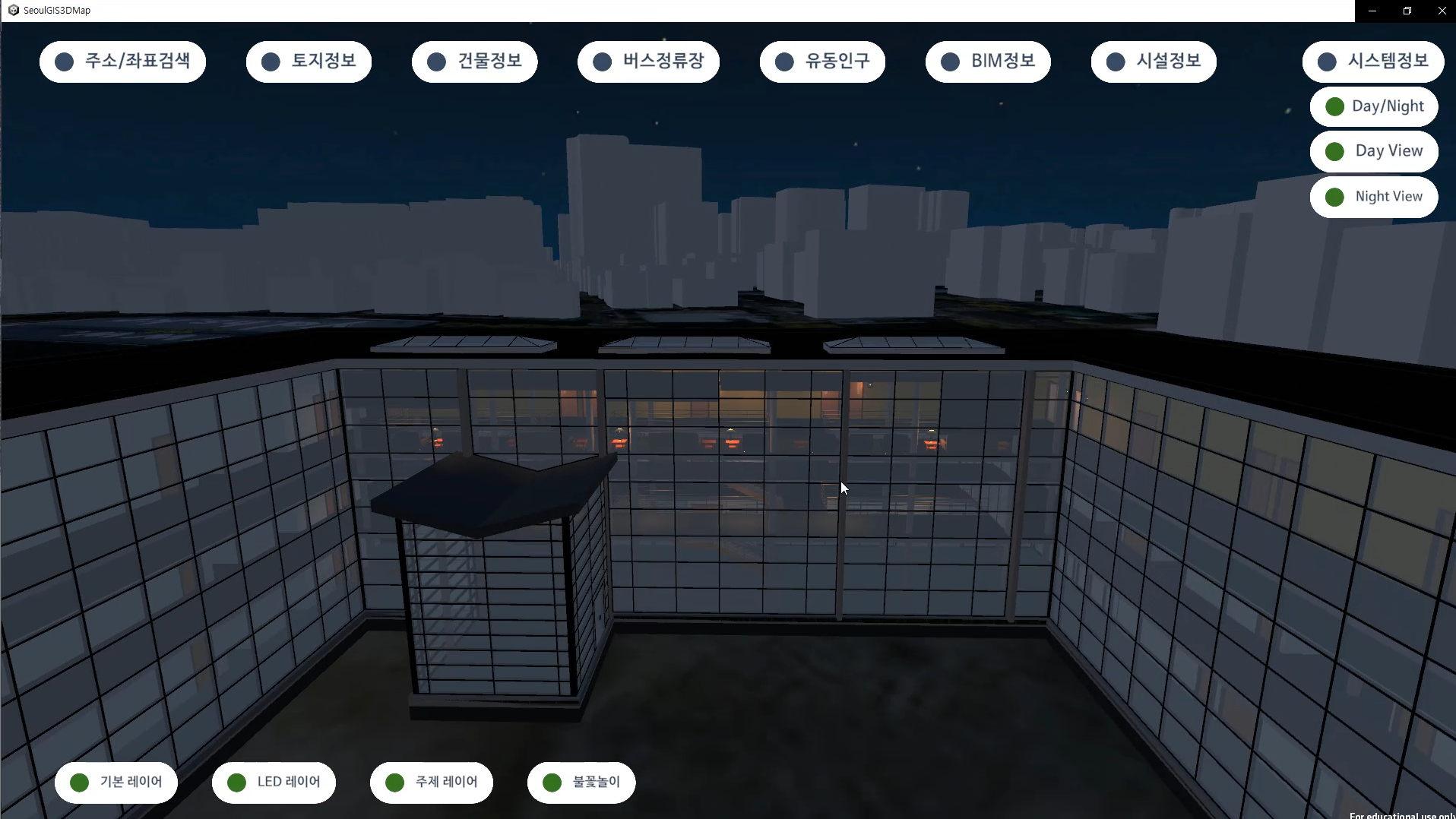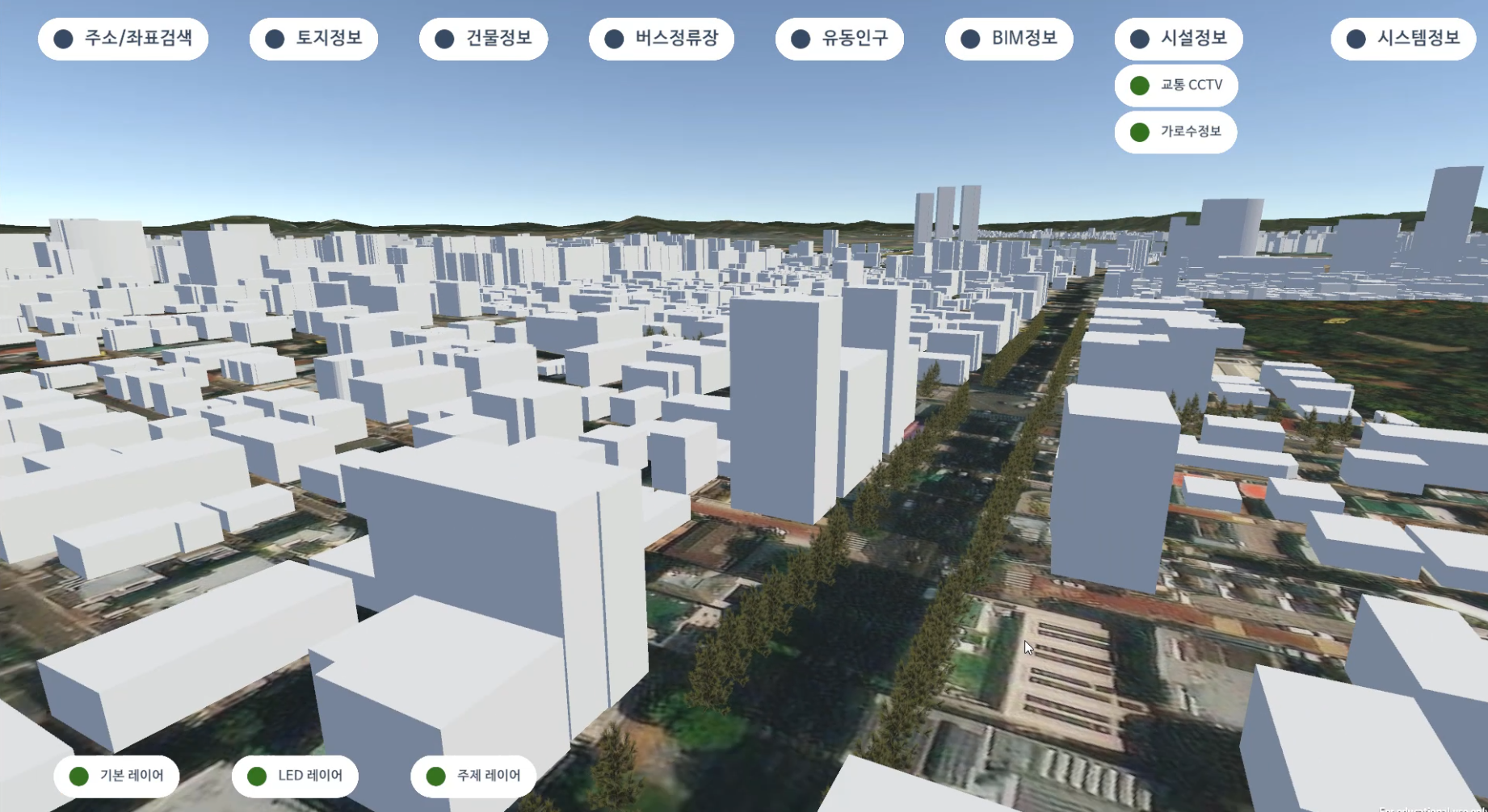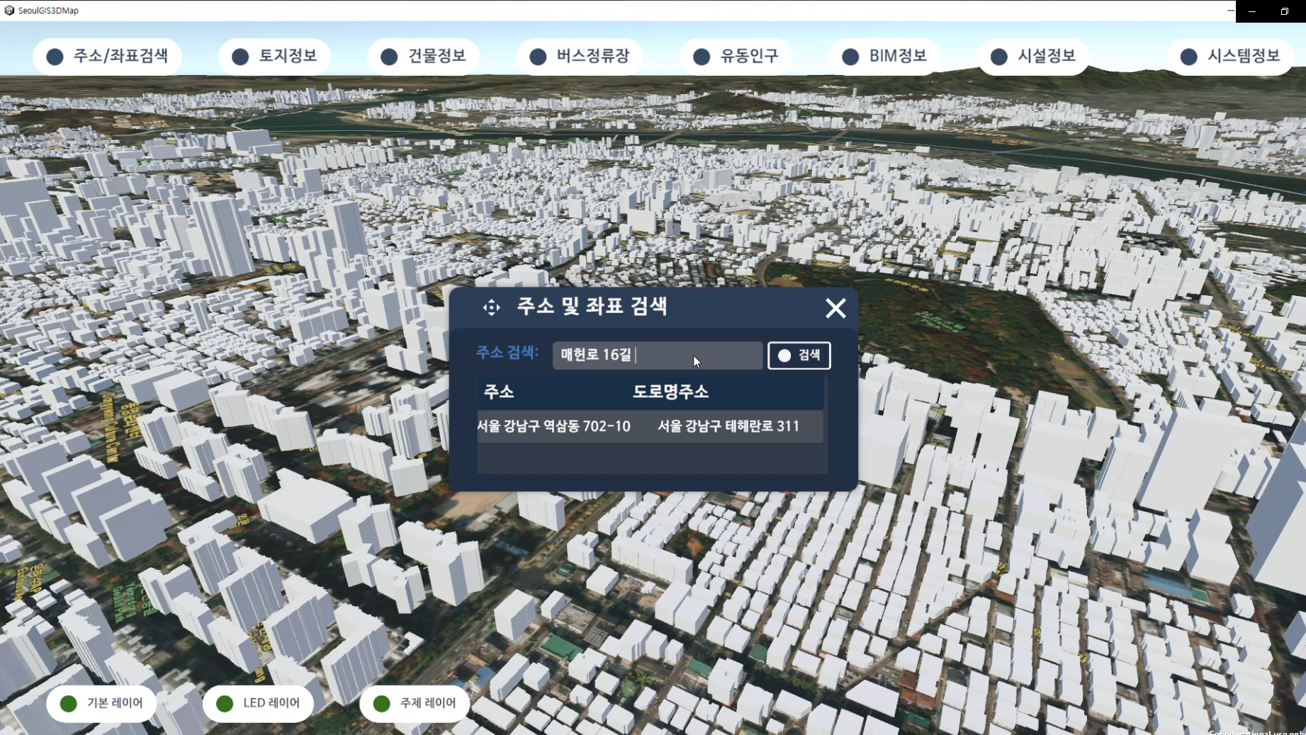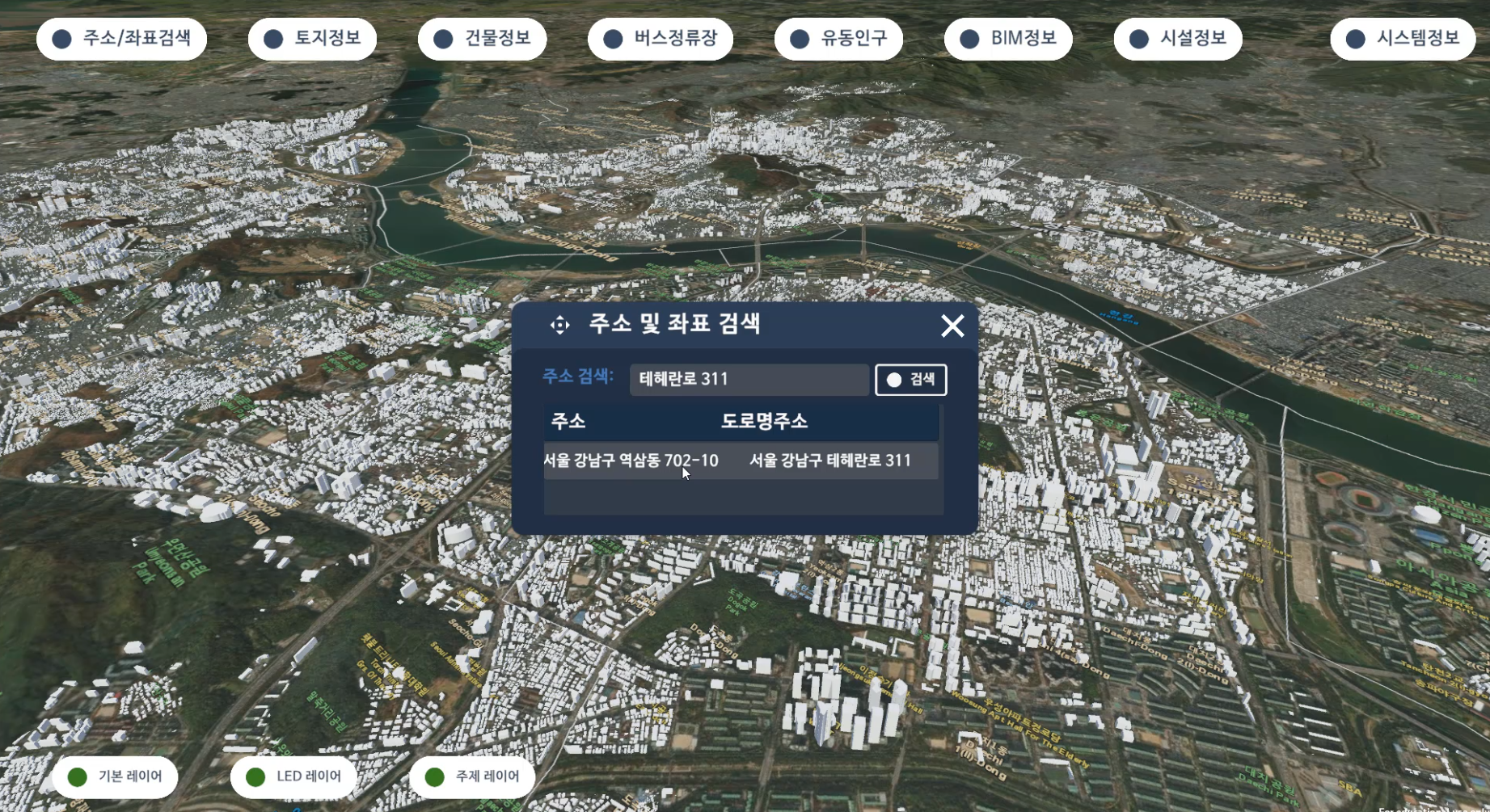 1) 주소 검색을 통한 지도 이동, 2) 선택된 건물의 토지 및 건물 정보, 3)지도 반경 300m안 정류소 정보, 4)서울스마트 유동인구 정보, 5)고속도로 CCTV 위치 및 영상정보 6)지도 반경 300m안 가로수, 7) 3D지도 낮/밤 환경 시뮬레이션
