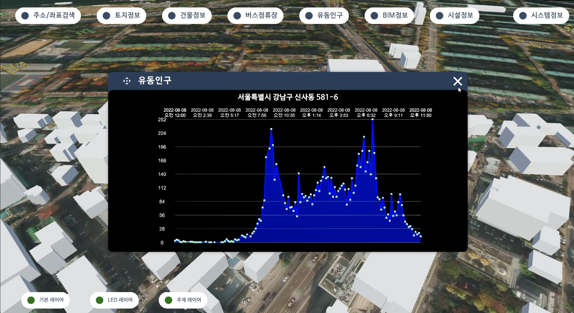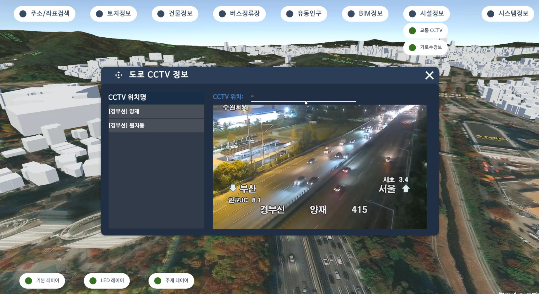 텍스트 정보로 오픈 되어 있는 국가정보공공 API들을 실시간 연계활용하고, 3D 공간지도에서 공간위치와 함께 다음과 같은 정보들을 확인하도록 제작되었습니다.