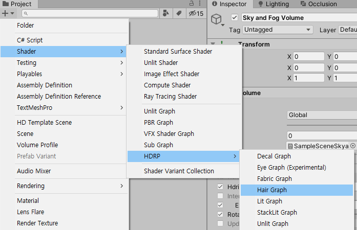 HDRP의 Hair shader는 Shader >> HDRP >> Hair Graph에서 생성해 사용할 수 있습니다. 옷과 헤어의 움직임에는 Deform Dynamic 을 적용했습니다. 좀 더 자연스러운 움직임을 만들기 위해 여러 가지 테스트를 진행하고 있다고 합니다.