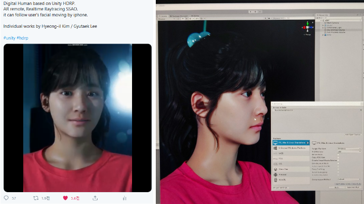 유니티 HDRP를 접했을 때 이 정도면 내가 원하는 정도를 리얼타임으로 구현이 가능할 거라고 생각했습니다. 그래서 회사를 그만두고 본격적으로 시작했습니다. 단순하게 리얼한 캐릭터를 CG로 보여주는 것으로 그치지 않고 디지털 연예인(Digital Celeb)으로 발전시킬 수 있지 않을까라고 생각했습니다. 단순하게 이미지를 가공해서 만들어진 가공의 사람이 아닌 실제 움직이고 상호작용도 가능하게요.