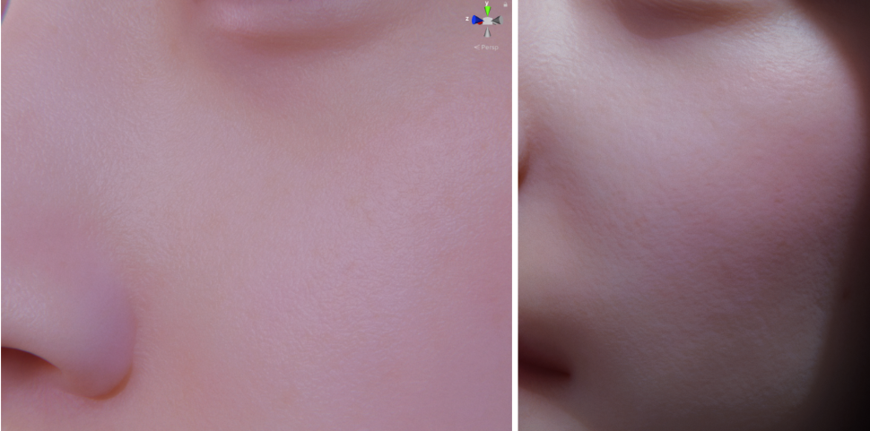 피부 표현은 여성 캐릭터를 만들 때 매우 중요한 부분 중에 하나입니다. HDRP의 StackLit을 사용해 특별한 수정 없이 그대로 사용하고 있으며, 8K Albedo texture를 기본으로 Detail texture를 추가로 사용해 근접했을 때 느껴지는 피부의 디테일한 질감을 표현하고 있습니다.
