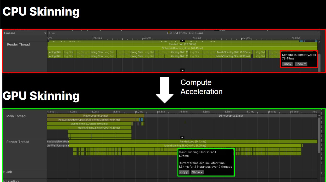 그리고 Skinned Mesh Renderer를 사용한 렌더링은 GPU에서 실행되는데, 많은 수의 애니메이션 캐릭터나 복잡한 메시를 다루는 경우 성능 병목의 원인이 됩니다.