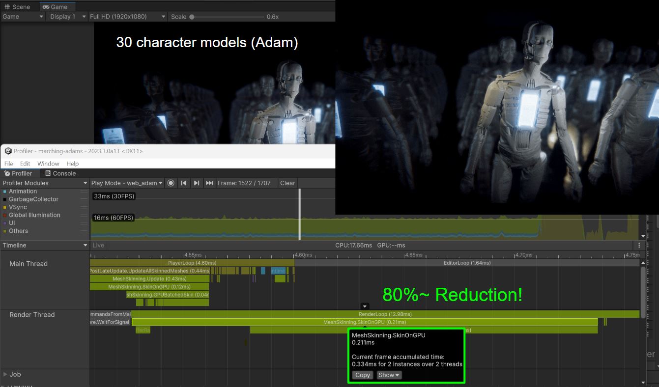 앞서 확인한 예시처럼 Batched Compute Skinning 은 스키닝 계산을 GPU에서 수행하여 많은 수의 메시를 한번의 GPU 호출로 처리할 수 있습니다. 이는 GPU에서 스키닝을 한번에 처리하여 CPU의 부담을 줄이고 GPU의 리소스를 효율적으로 사용하는 방법입니다. 또한 이 구성은 가능한 많은 Skinning Dispatch 를 배치하여 병렬로 변형되는 정점의 양을 늘리고 GPU 동기화를 줄입니다. 결과적으로 모든 플랫폼에서 Skinned Mesh Renderer 의 GPU 성능이 향상될 수 있습니다.