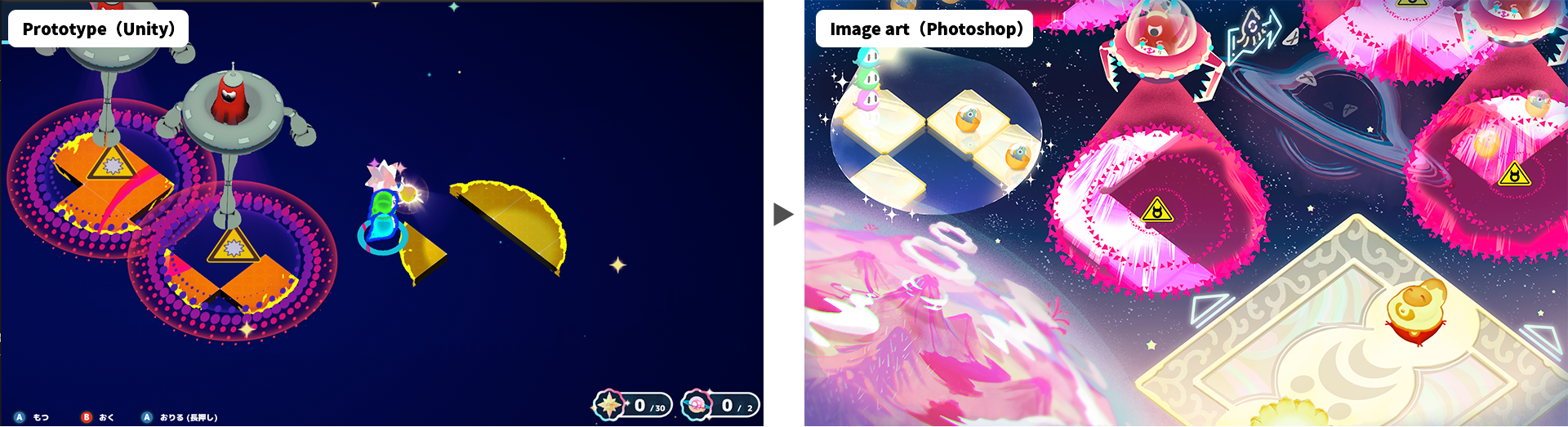 가장 애착이 가는 디자인은 플레이어 캐릭터인 ‘수이수이(Sui-Sui)’입니다. 일본 전통 유령화에서 흔히 보이는 머리에 삼각형 천(*1 천관, 天冠)을 두른 영혼의 모습에서 영감을 얻어 이를 굉장히 미니멀하게 다듬었습니다. 원과 삼각형 같은 기본 도형만 사용해 누구나 쉽게 기억하고, 아이들도 직접 그릴 수 있을 만큼 친근한 캐릭터를 목표로 했습니다.