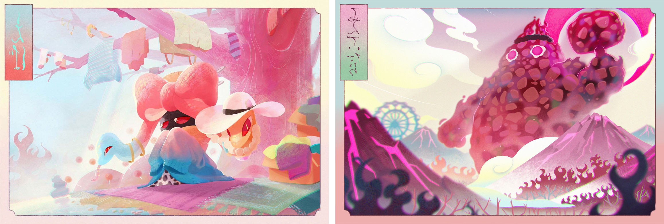 반면 지옥 측 캐릭터들은 훨씬 화려하고 다채로운 색감을 사용해 대비를 주었습니다. 예를 들어 스킨 상점의 주인인 ‘에바(Eva)’는 일본 설화 속 ‘닷츠에바(Datsueba)’라는 귀신에서 모티프를 가져왔습니다. 닷츠에바는 삼도천에 도착한 망자의 옷을 벗겨 죄의 무게를 다는 존재로 알려져 있는데, 저희는 이를 재해석해 빼앗은 옷들로 패션을 즐기는 귀여운 캐릭터로 만들었습니다. 머리에는 뱀 모양의 리본을 달아 포인트를 주었죠.