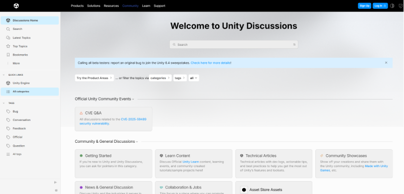 개발 중 기술적인 벽에 부딪히면 가장 먼저 유니티 공식 문서와 포럼을 찾습니다. 사실상 대부분의 문제에 대한 해결책은 공식 문서 안에 있다고 봐도 무방합니다. 문서에서 답을 찾기 어려운 경우에는 Unity Discussions(유니티 디스커션)에 직접 질의하며 전 세계 개발자들과 소통하기도 합니다. 최근에는 생성형 AI가 비약적으로 발전한 덕분에, 최신 기능이 아닌 일반적인 문제들은 AI와의 질의응답을 통해 빠르게 해결책을 찾아내며 개발 효율을 높이고 있습니다.