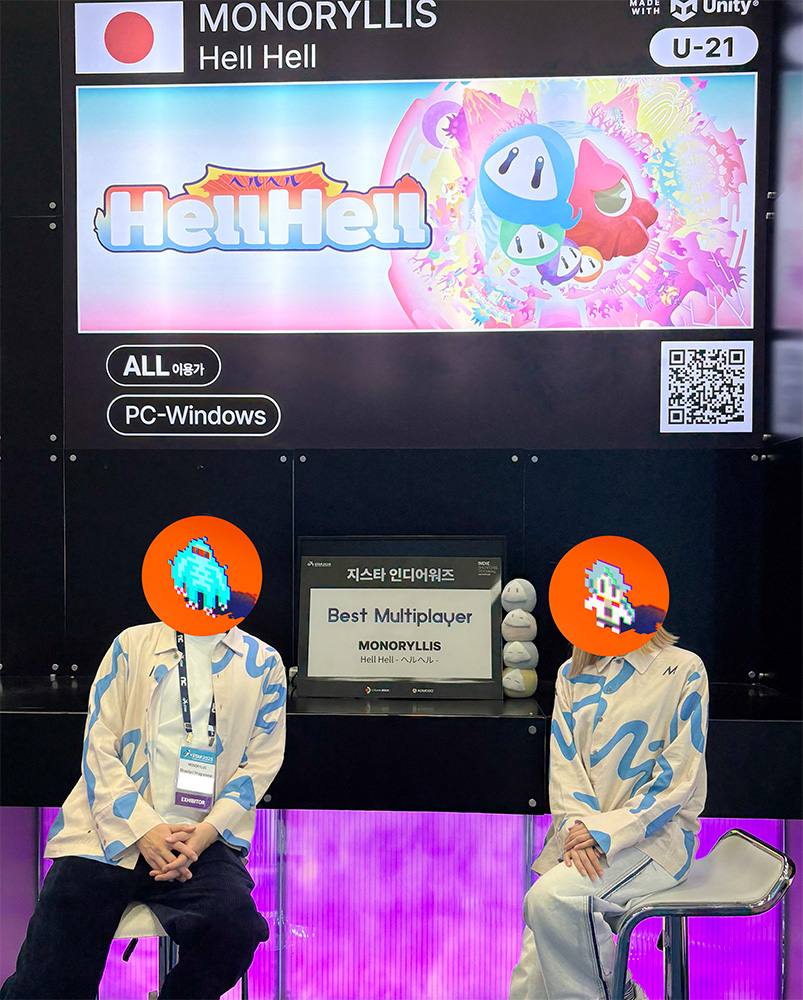 첫 해외 전시라 처음엔 무척 긴장했습니다. 하지만 많은 분이 즐겨주셨고, 지스타 인디 어워즈에서 ‘베스트 멀티플레이어’ 상까지 받게 되어 잊지 못할 즐거운 경험이 되었습니다. 특히 한국 게이머들의 열정적인 에너지가 인상적이었습니다. 쉬운 단계와 어려운 단계 중 선택하라고 하면 대부분 주저 없이 어려운 단계를 고르는 모습이 인상적이었습니다. 보통 일본에서는 보기 드문 반응이라 무척 신선하고 놀라웠습니다.